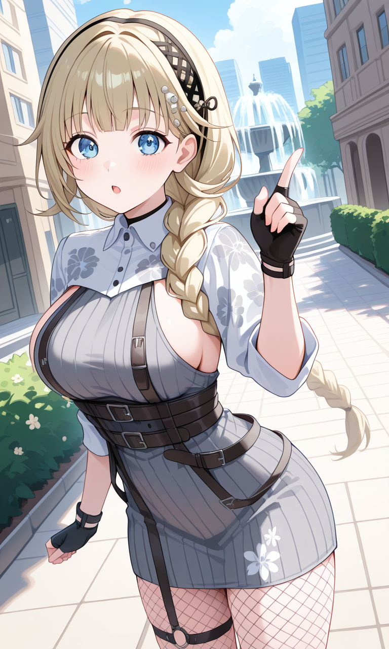 hanabusa lisa, lisa fourth, hair ornament, hairband, braided ponytail, ribbed dress, grey dress, frilled shrug, floral print, sideboob, belt, fingerless gloves, thigh strap, fishnet pantyhosebraided ponytail, hair over shouldersまたはshort hairを使用して髪型を変更できます。