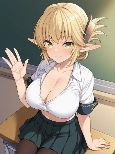 Apperance: ilaegis, pointy ears, blonde hair, short hair, folded ponytail, black hairpin, green eyes, large breasts