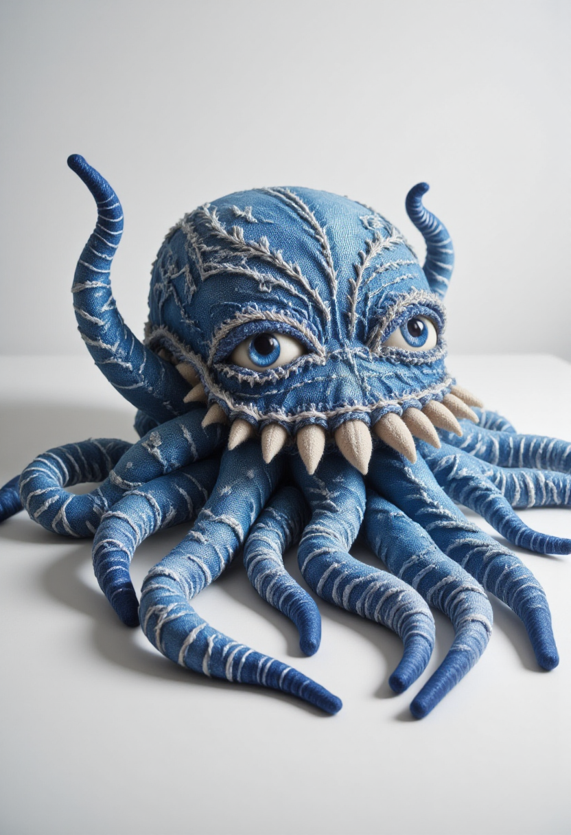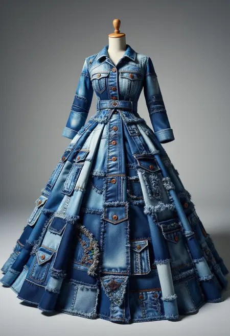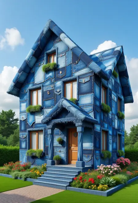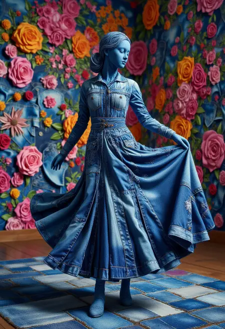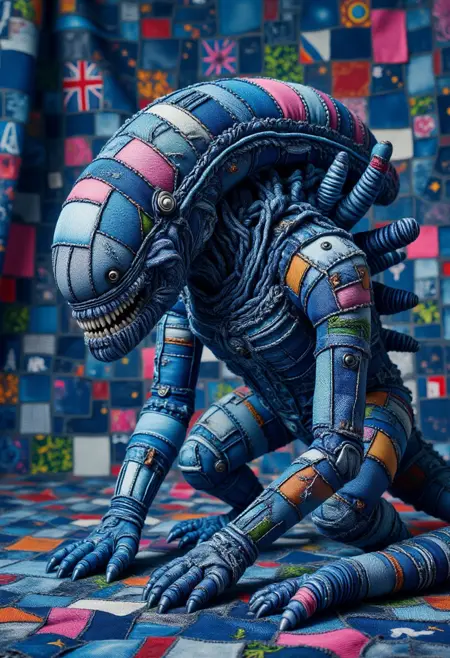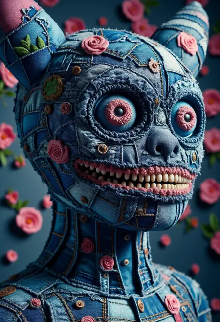 - 图像为一幅高度精细的数字艺术作品,描绘一个大型、风格化的 (主体),由多块牛仔布拼接而成,呈现出蓝白牛仔纹理交织的拼布外观。
