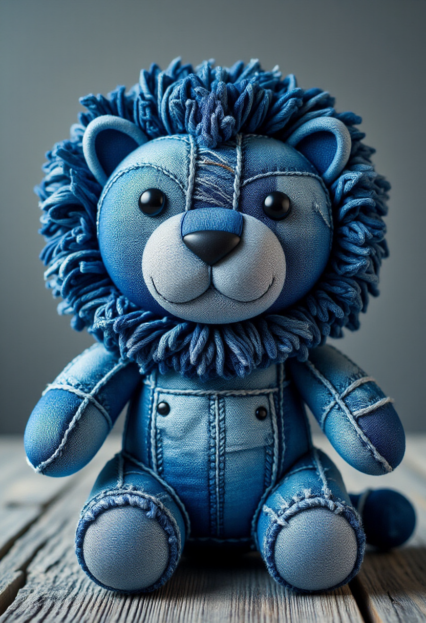 - 图像为一张照片,展示一个毛绒玩具 (主体),外表仿若蓝色牛仔布材质,带有磨损、做旧的质感。