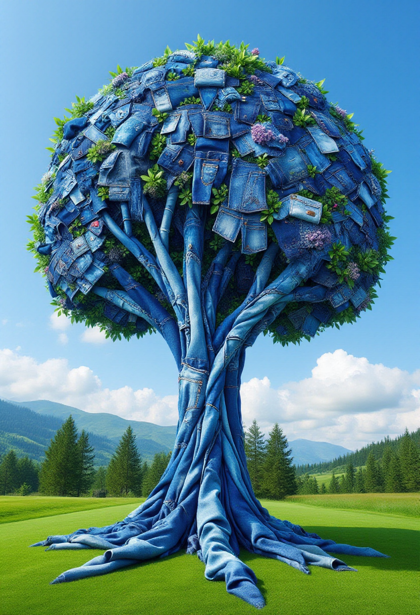 - 图像为 (主体) 的CGI渲染图,设计成由牛仔布拼贴而成的被单,整体呈现一种奇幻、超现实的 (地点) 风格。