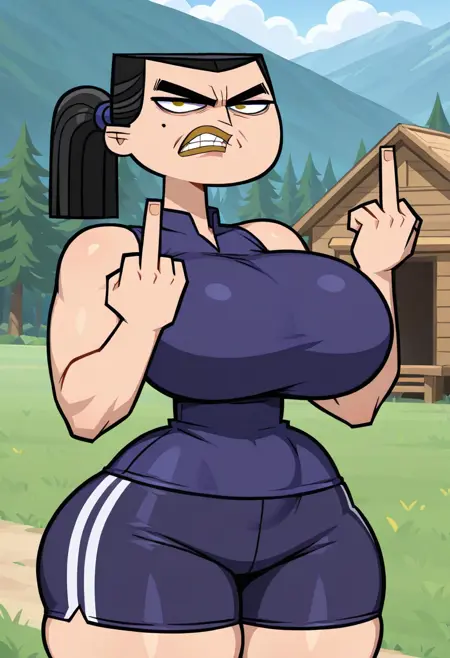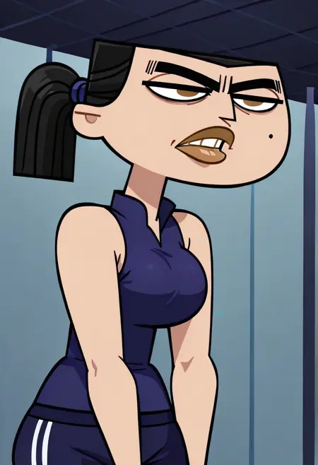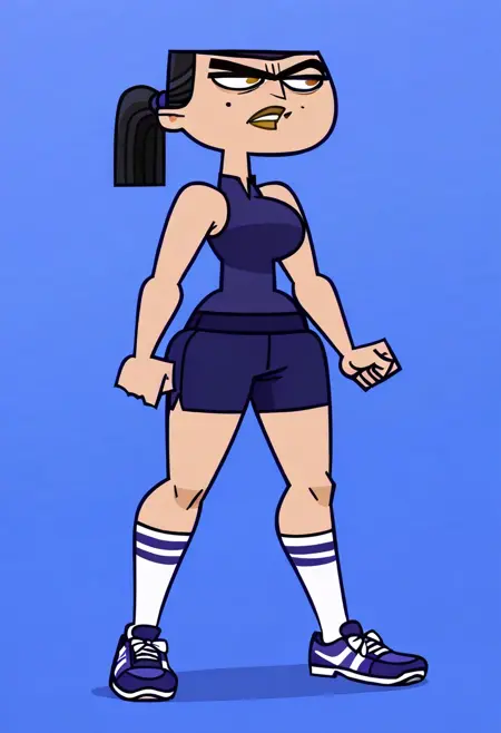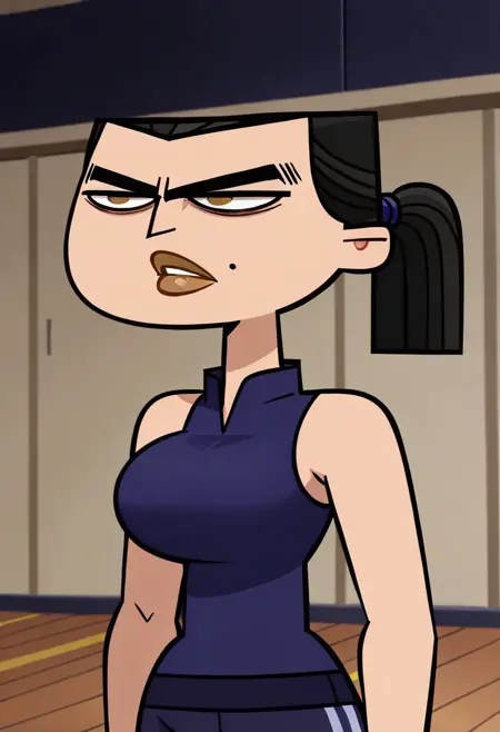 EvaTDI, 1girl, black hair in a ponytail, hazel eyes, unibrow, dark blue sleeveless polo, dark blue athletic shorts, white tube socks with dark blue stripes, blueish-black running shoes, lips, big lips, mole on cheek,