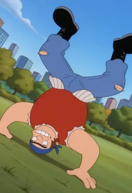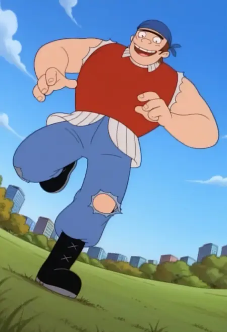 トーバルド、1人の少年、単体、青いバンダナ、茶色の髪、黒い目、つながった眉、太い眉、大きな体、赤いノースリーブシャツ、破れたジーンズ、青いズボン、黒いブーツ、