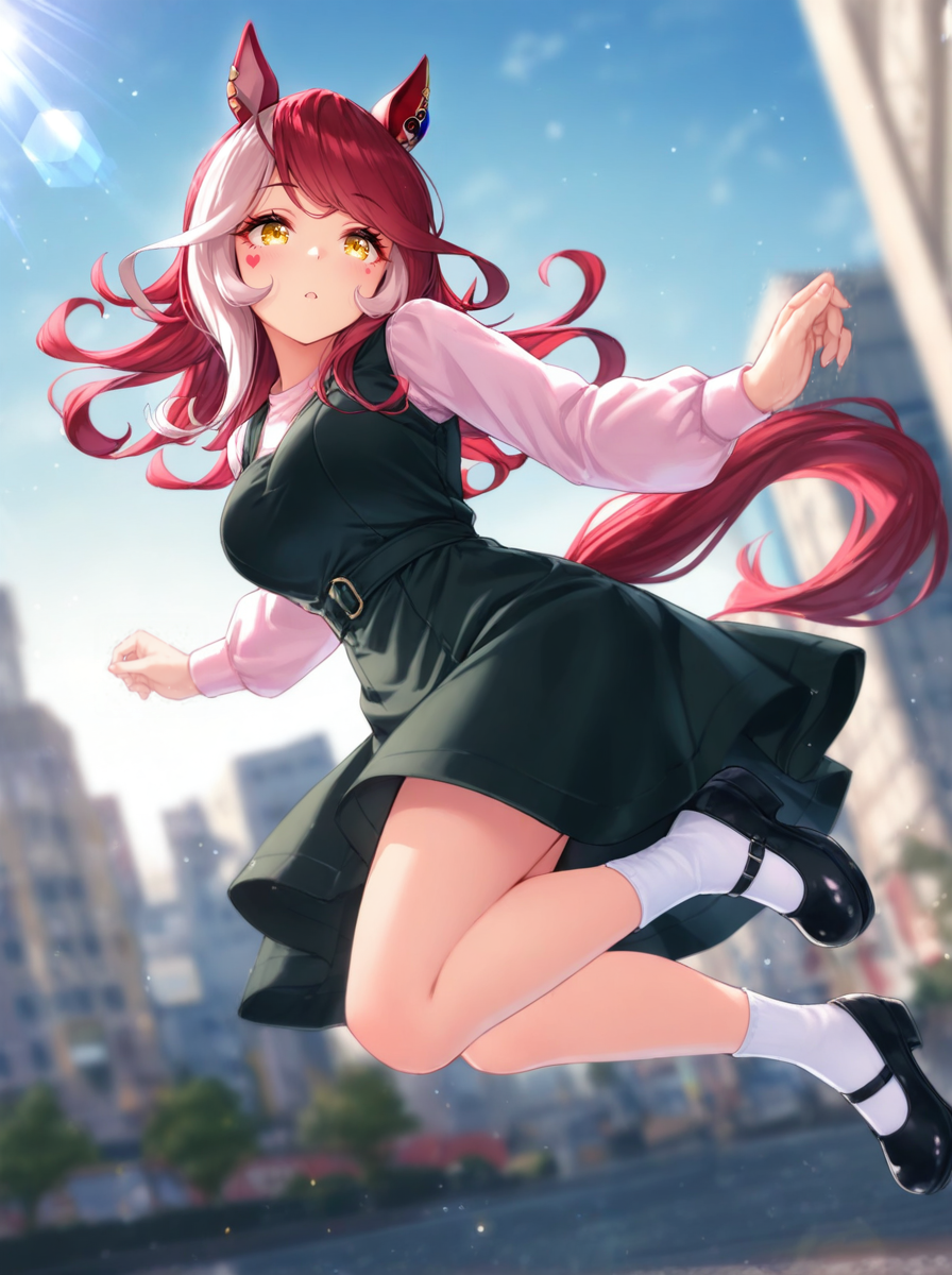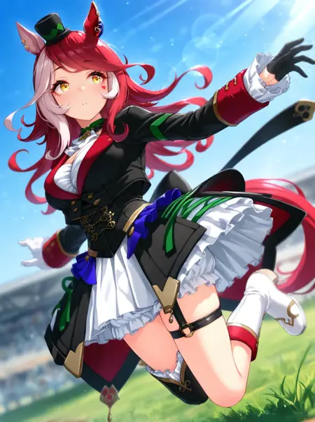 말 귀, 불일치하는 반장갑, 말 꼬리, 비대칭 부츠, 허벅지 스트랩, 긴 소매, 불일치하는 귀 커버, 검정 크롭 재킷, 검정 미니 모자, 주름진 흰 드레스, 검정 아우터스커트, 검정 코르셋, 흰 아스콧, 귀 피어싱, 낮은 등 검은 리본, 얼굴 문신