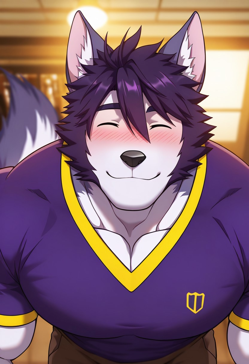 강화 프롬프트: "늑대 소년, 퓨리, 꼬리, 파란 눈, 근육질, 남성적, 큰 유방근"