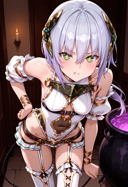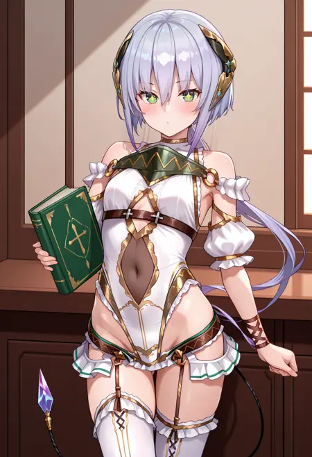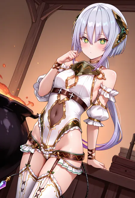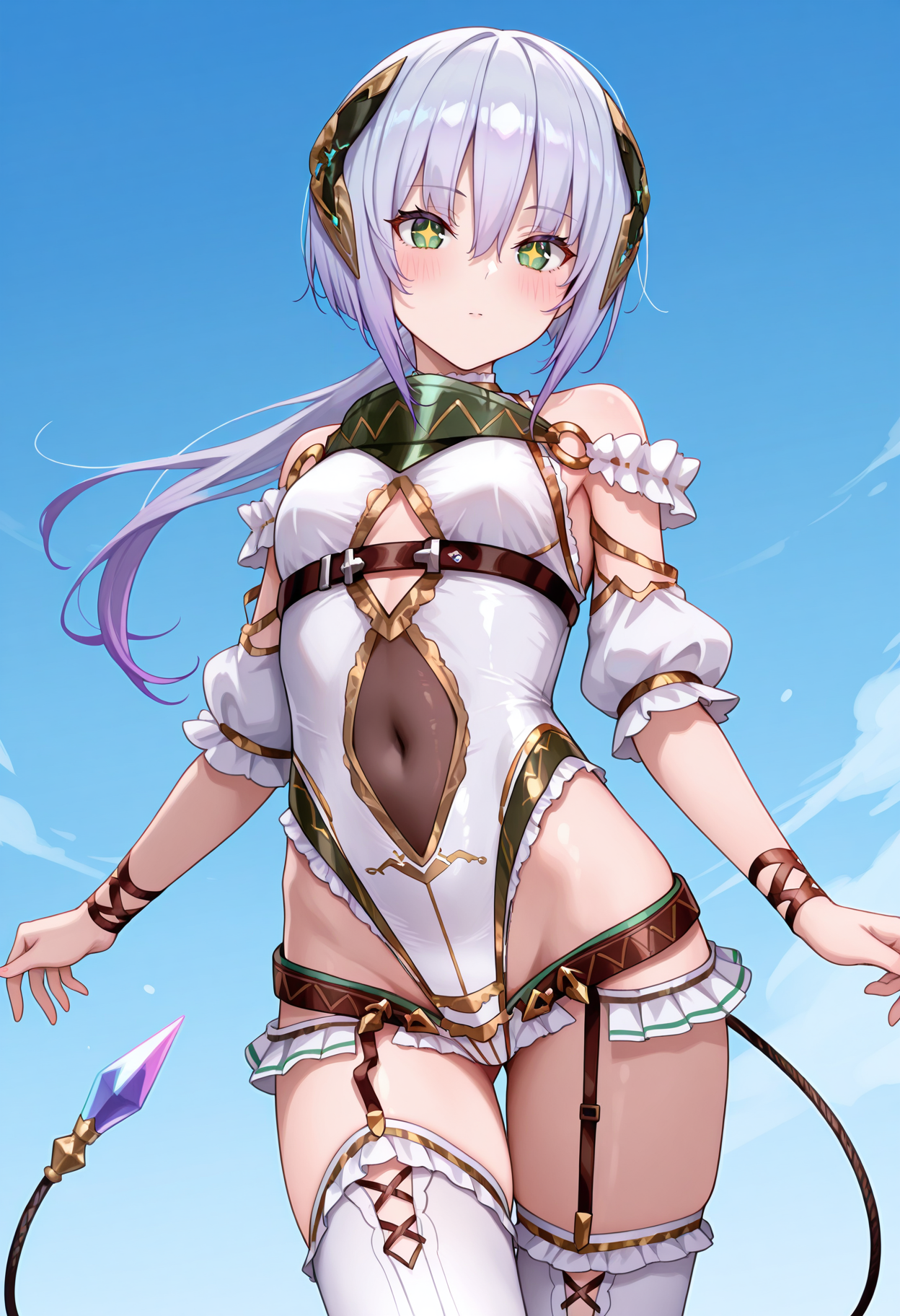 plsp1def, 低马尾, 头饰, 白色紧身衣, 荷叶边紧身衣, 高开衩紧身衣, 露肩, 胸甲, O型环, 胸带, 裸露肚脐, 衣服开衩, 金色镶边, 胳膊臂章, 可拆卸袖子, 手腕绑带, 歌舞女郎裙, 髋部开衩, 低裙摆, 腰带, 白色过膝袜, 交叉系带腿饰, 吊袜带, 电缆尾, 无趾腿饰,