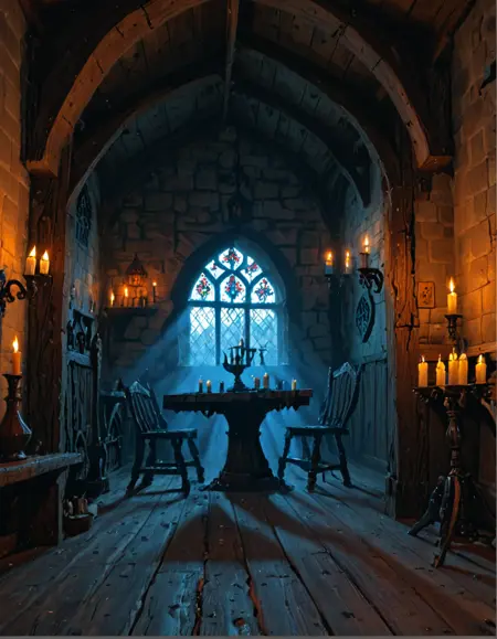 MUR0, very dark, pitch dark, medieval, candles, high ceiling, moon light, moon shades, gold, silver, room, rosace stained glass, arches, medieval furniture, blue, medieval detailed architecture, detailed wall carvings, detailed arches carvings,