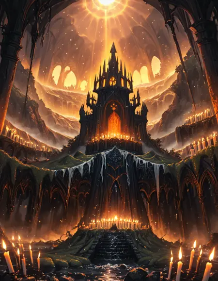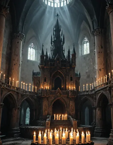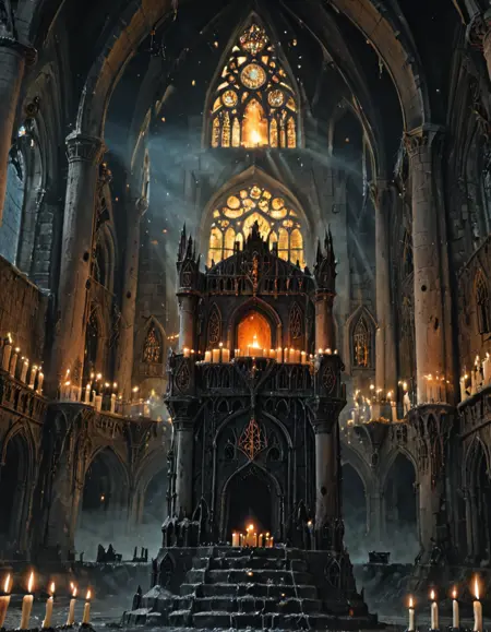 MA0, gold room, medieval, candles, gold carvings, huge room, huge big rosace stained glass windows, huge skylight, irregular arches, detailed wall carvings, irregular architecture, stairway, very high ceiling, worn, old,