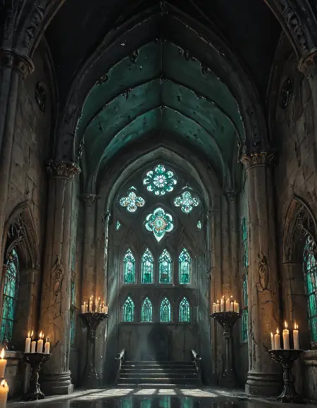 MUR0, very dark, pitch dark, medieval, candles, high ceiling, moon light, moon shades, gold, silver, room, rosace stained glass, arches, medieval furniture, blue, medieval detailed architecture, detailed wall carvings, detailed arches carvings,