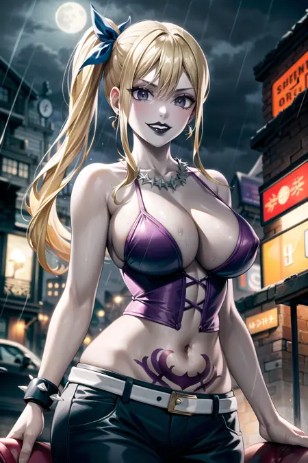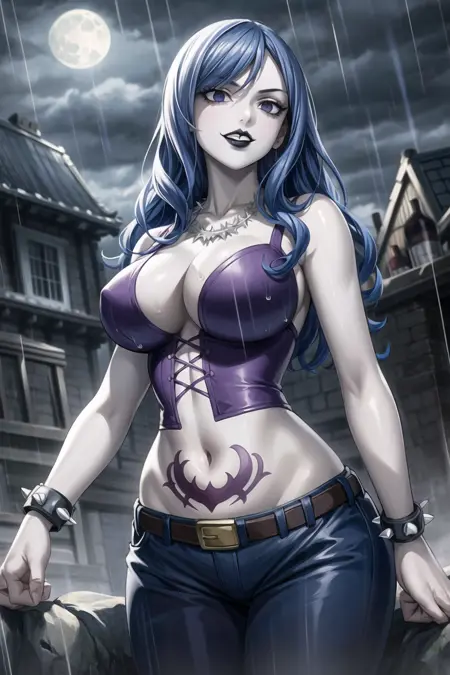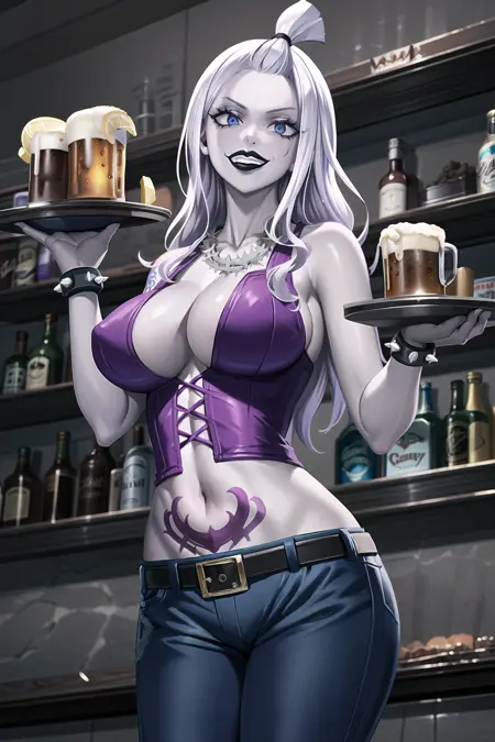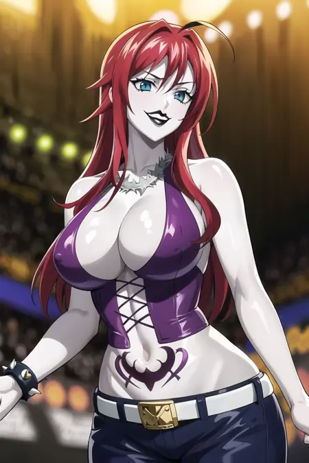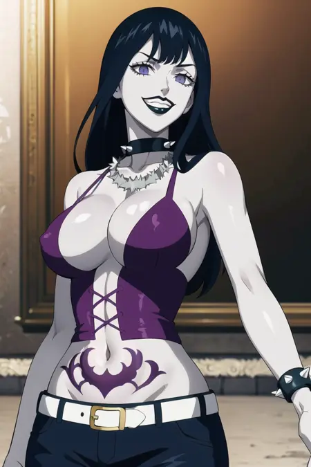 色付きの肌、白い肌、薄い肌、スパイク付きブレスレット、スパイク付きリストバンド、悪魔的な笑み、鋭い歯、悪意ある表情、サディスティックな笑み、RockOfSuccubus、唇、黒い唇:1.2、笑み、観察者を見つめる、赤い目、微笑み、悪魔的な笑顔、ネックレス、大きな胸、へそ、胸元、腹部、ベルト、黒いズボン、恥骨のタトゥー、光沢のある服、ラテックス製トップ、クロスレースアップトップ、光沢のあるトップ、紫のショートトップ、肩出し、スパイク付きブレスレット、バストイエ、白いベルト,