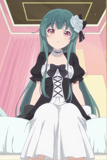 フォーマルドレス:yuna-k, yuna-fancy, 1girl, テアルカラーの髪, 長い髪, 赤い目, fancy_black_and_white_dress, fancy_corset_top, fancy_big_bow, fancy_flower_hair_ornament, fancy_choker, fancy_frills, kuma_black_bear_glove_right, fancy_skirt, 白いスカート, ロングスカート