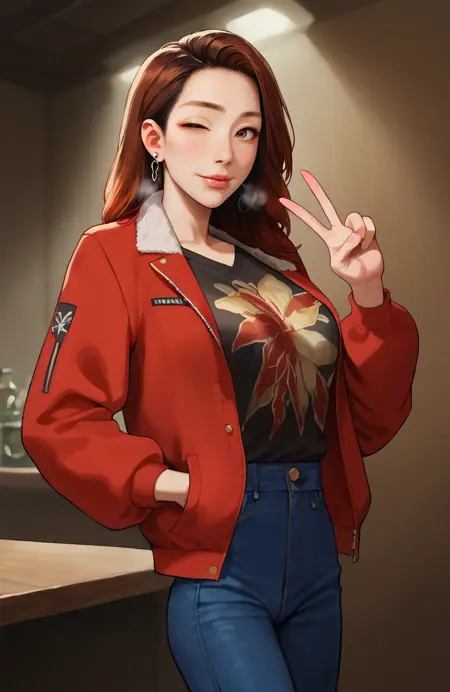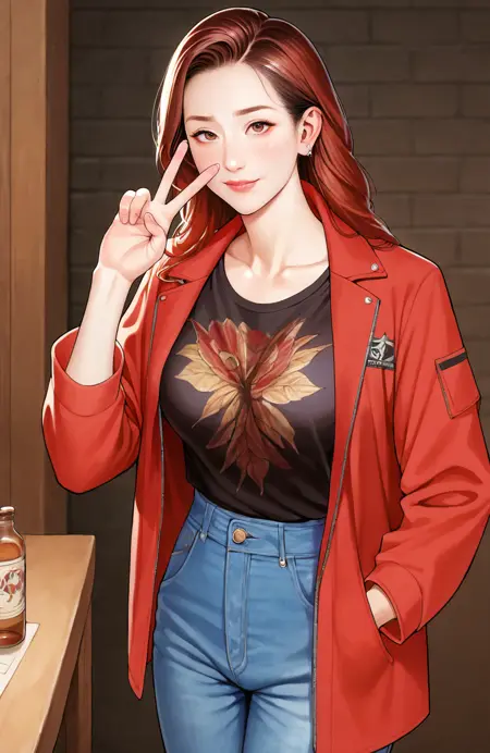 옷 1: 빨간 재킷, 청바지, 검은 티셔츠, 플로럴 프린트 셔츠,