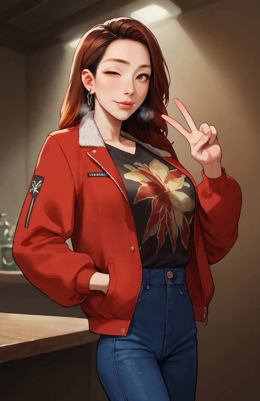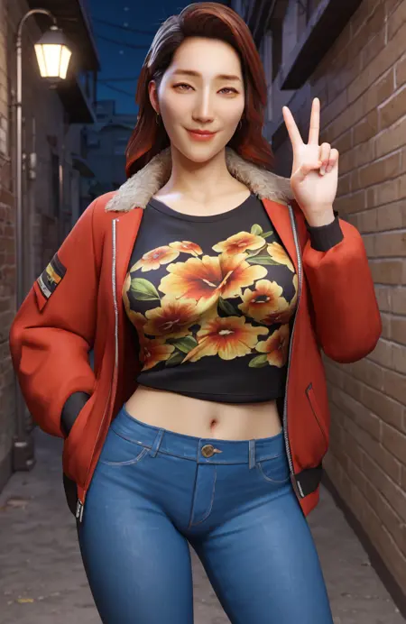服装1:红色夹克,牛仔裤,黑色T恤,花卉图案衬衫,