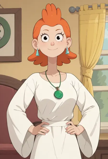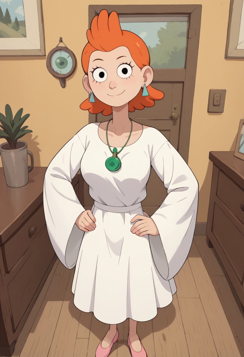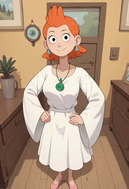 복장: 긴 느슨한 소매가 있는 흰색 드레스, 목에 녹색 메달리온, 밝은 분홍색 평발 신발