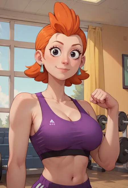 1girl, solo, Sue_C, 밝은 피부, 검은 눈, 짧고 볼륨 있는 머리, 화려한 오렌지색 머리, 밝은 파란색 삼각형 귀걸이