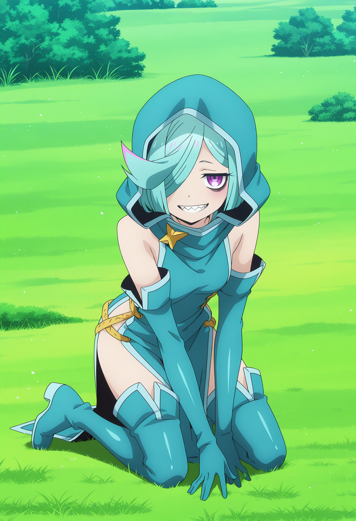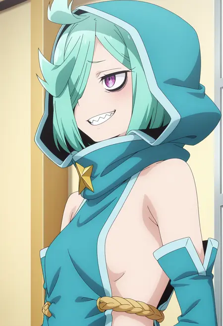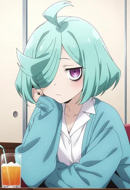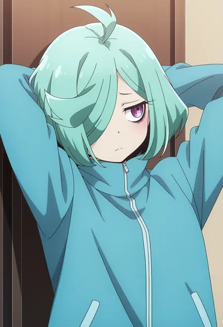 Nemo, hair over one eye, ahoge, purple eyes, green hair, short hair, fang, bags under eyes,