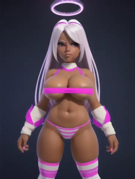 1girl, solo, long hair,thighhighs, navel, underwear, purple eyes, panties, white hair, striped,nail polish, dark-skinned female, halo, solo