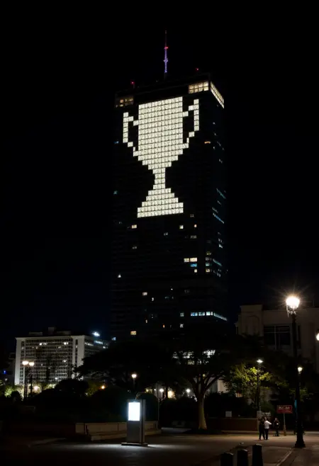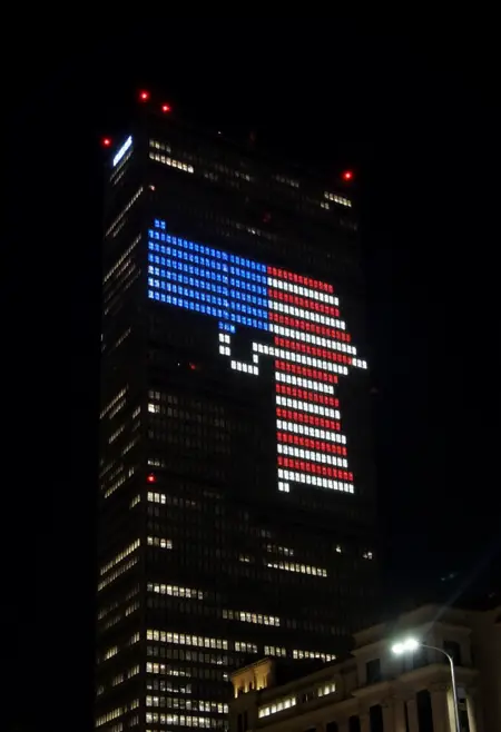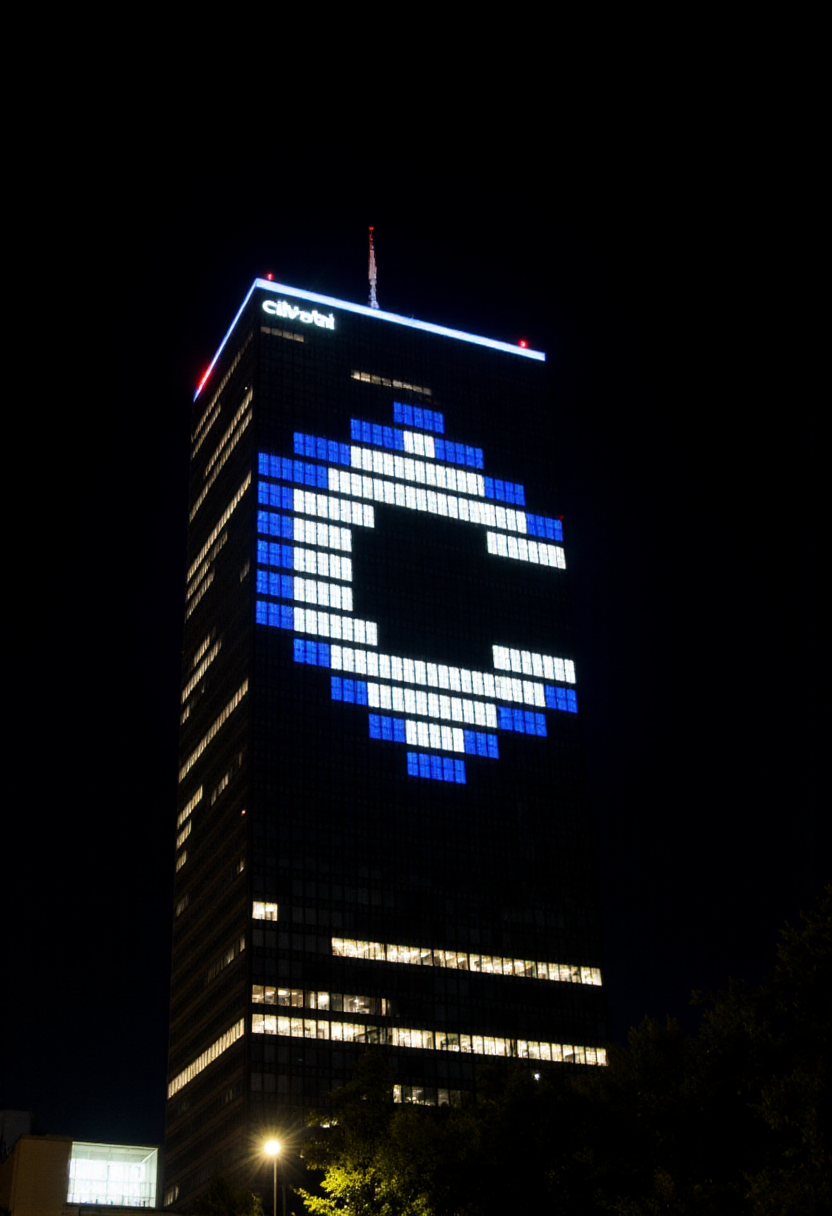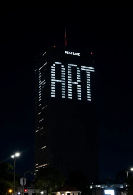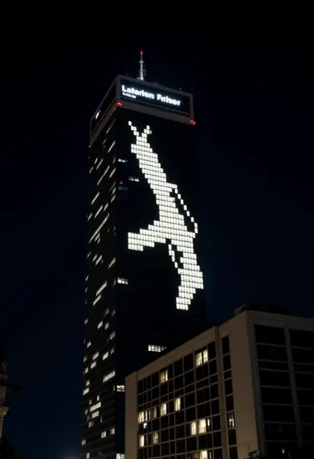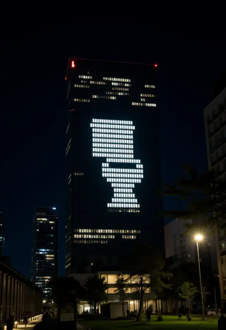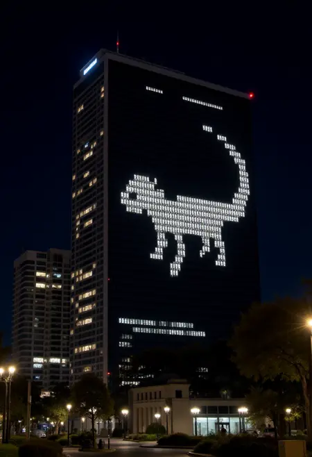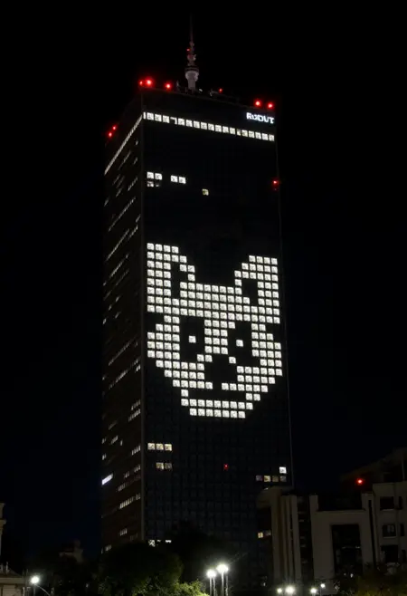 現代的な超高層ビルの夜景写真。外観には大きなピクセル化された (SUBJECT) が照明で表現されている。