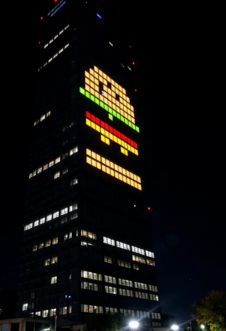 このモデルでは、テキストやテーマを入力すると、夜のタワーのオフィス照明を使ってピクセルアートスタイルで表示されます。