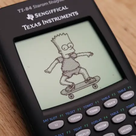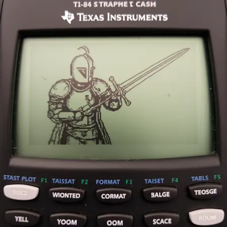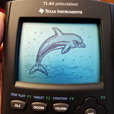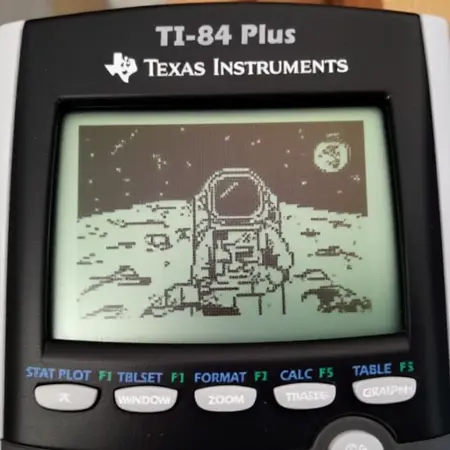 Prompting: The image is a photograph of a Texas Instruments TI-84 graphing calculator, specifically focused on its screen displaying a pixelated drawing of (SUBJECT).