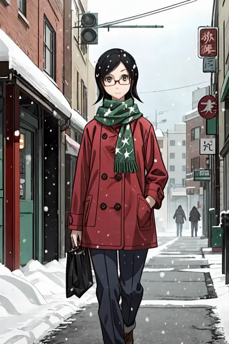 コート:赤いコート、緑のスカーフ、ズボン