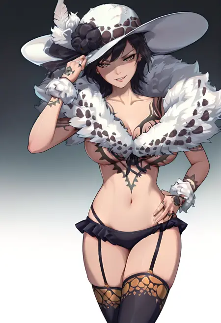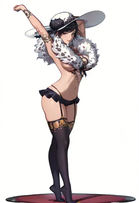 dr_l, 1girl, tattoo, thighhighs, feather boa, garter straps, underwear, microskirt, panties, large breasts,white hat, black hair,