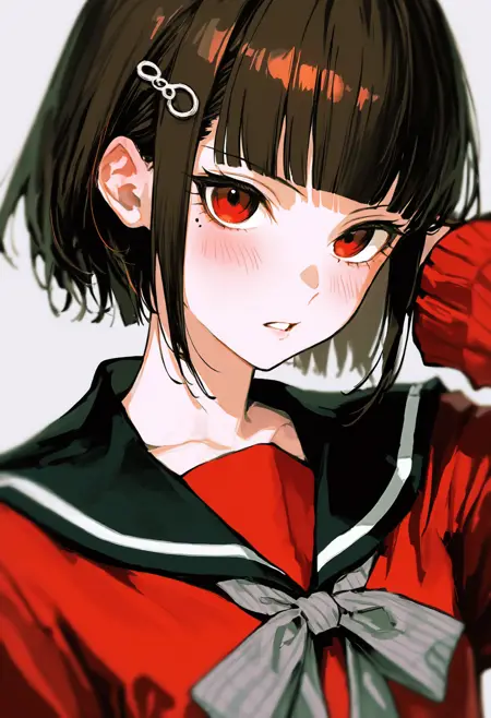 1girl, solo, eye focus, fourth east high school uniform, pinafore dress, ringed eyes, sleeveless dress, red eyes, dress, school uniform, looking at viewer,