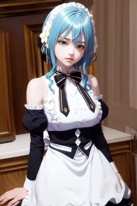 デフォルトの衣装:裸の肩、ノースリーブシャツ、白いシャツ、白いエプロン、黒い袖、取り外し可能な袖、黒いボウタイ、フリルスカート、大腿ストラップ