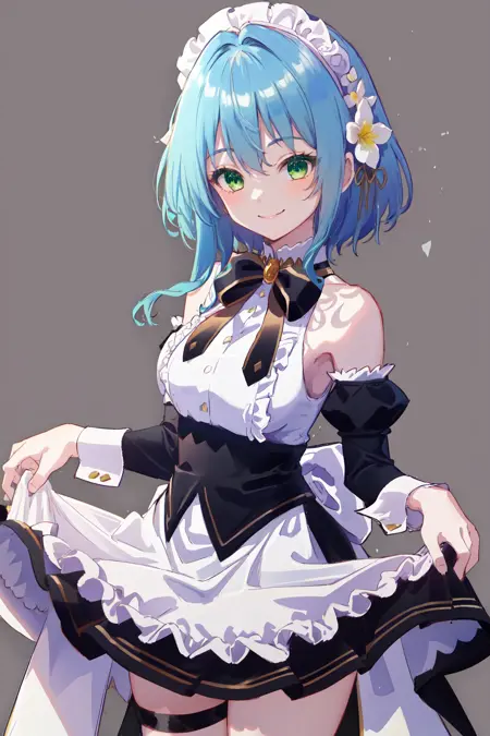 キャラクタートリガー(no_outfit):1girl 青い髪 緑の目 ヘアリボン ヘアフラワー(no_outfitバージョンでは「青い髪」を追加する必要があります😢)