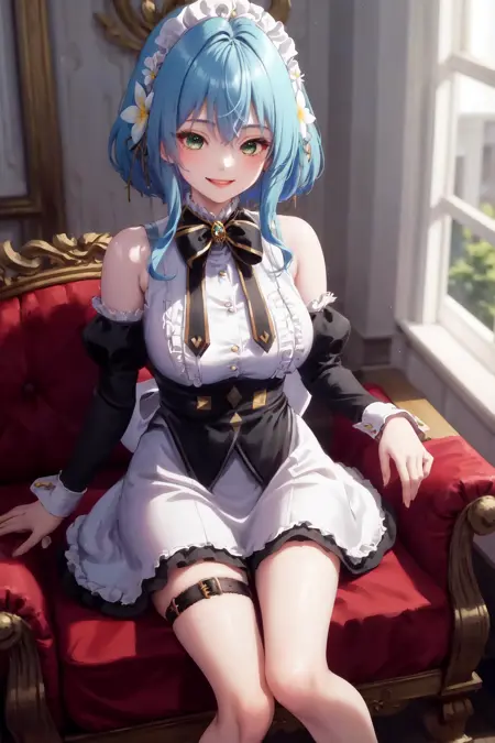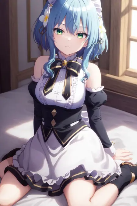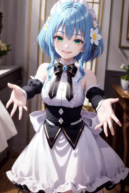 キャラクタートリガー(v1.0):1girl 緑の目 ヘアリボン ヘアフラワー(「青い髪」を削除すると一貫性が向上します)