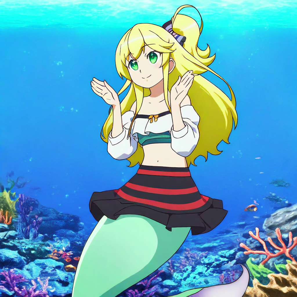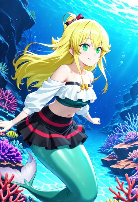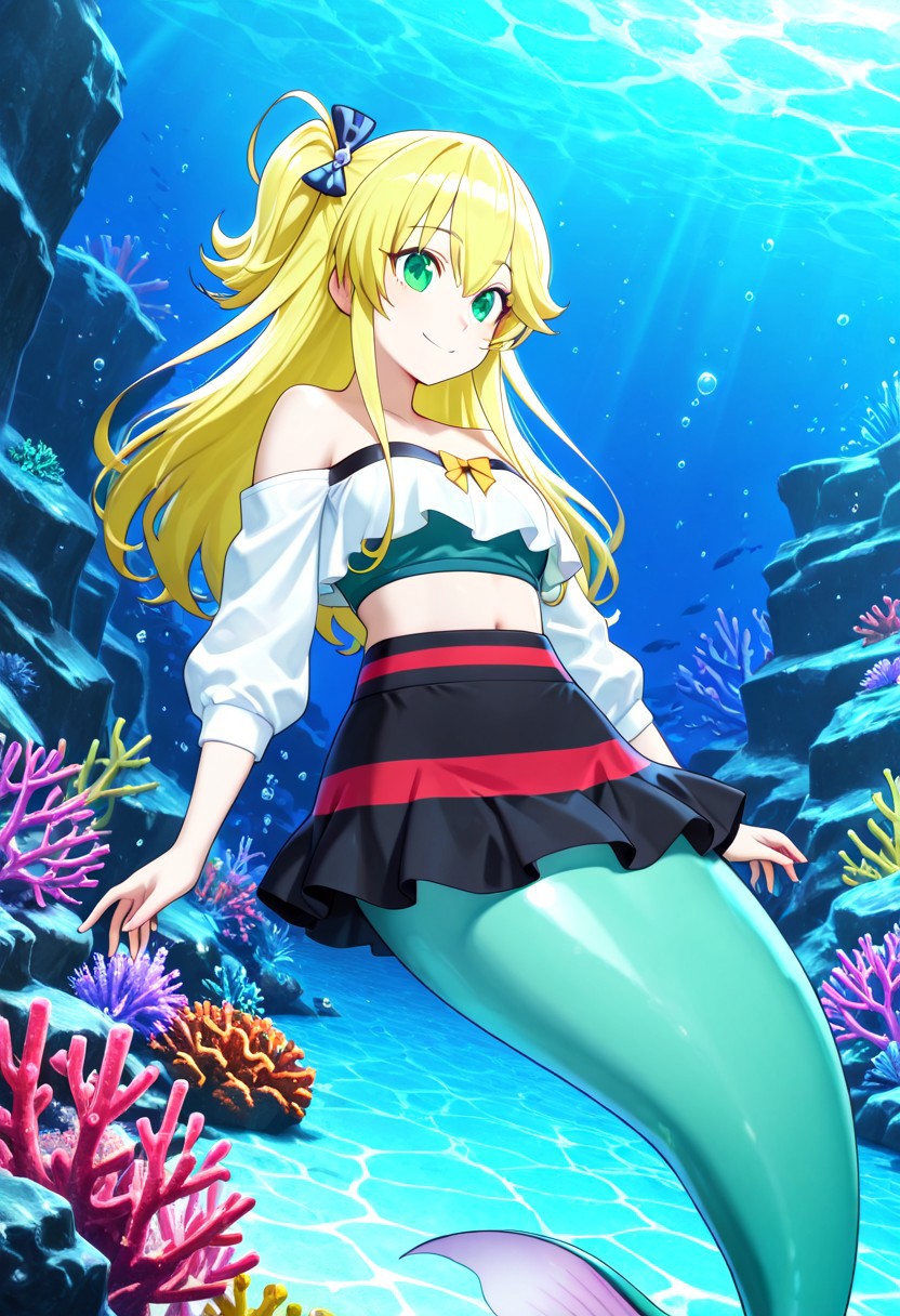 Appearance: blonde hair, long hair, side ponytail, green eyes, monster girl, mermaid, mermaid tail, green tail