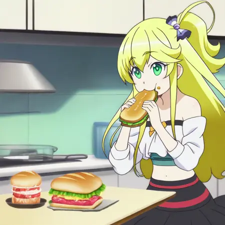 Alternate outfit: green shirt, bare shoulders, shirt straps, blue skirt, hair scrunchie, bracelet