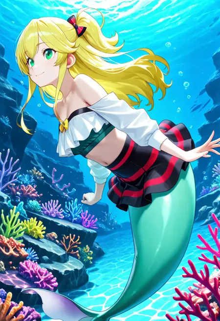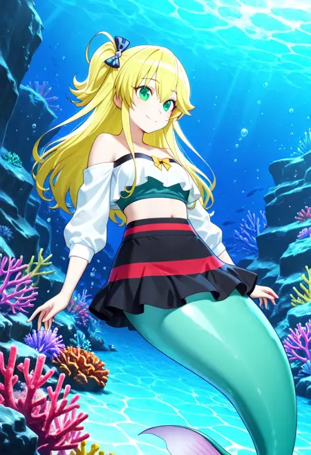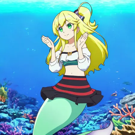 외모: 금발 머리, 긴 머리, 사이드 펀테일, 녹색 눈, 몬스터 걸, 인어, 인어 꼬리, 녹색 꼬리