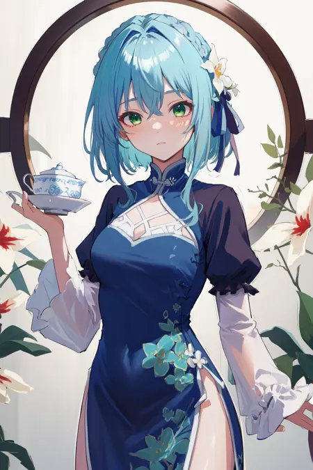 角色触发词(no_outfit):1girl 蓝发 绿眼 发带 发饰花(使用no_outfit版本时需要添加“蓝发”😢)