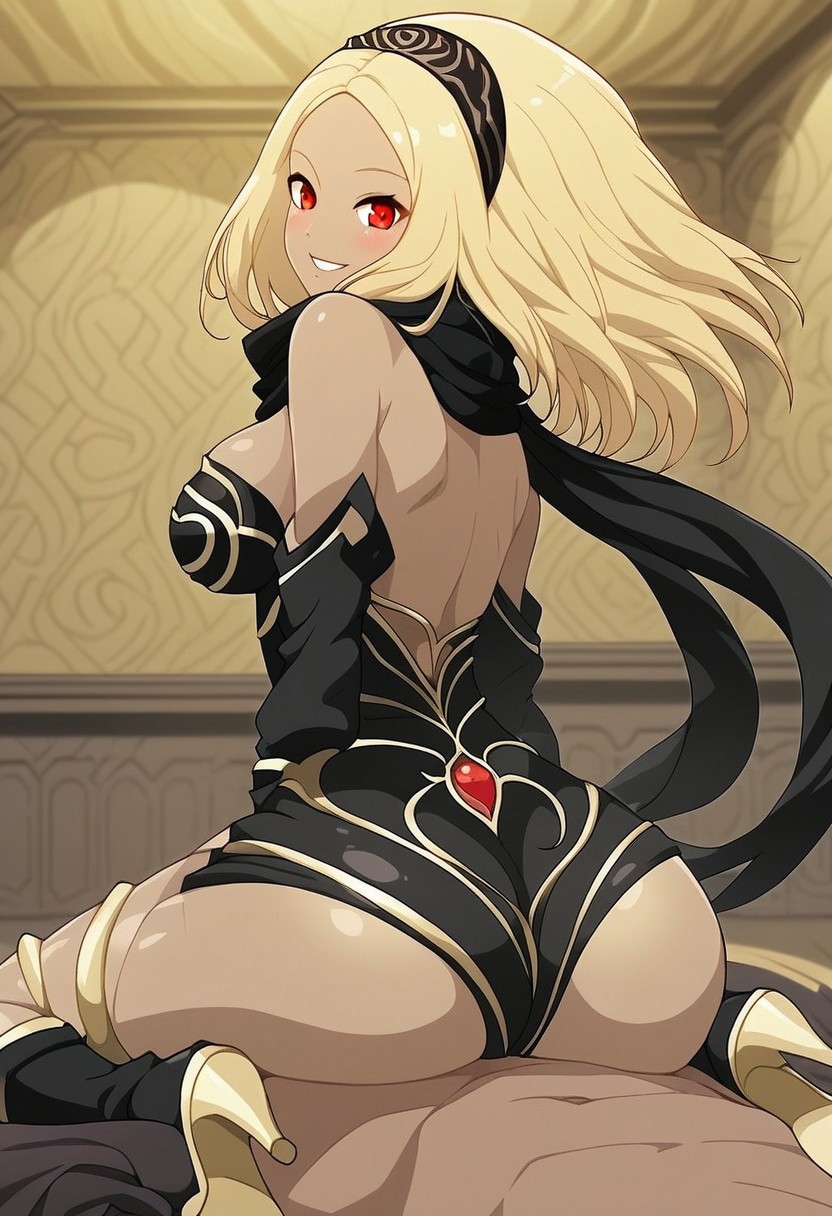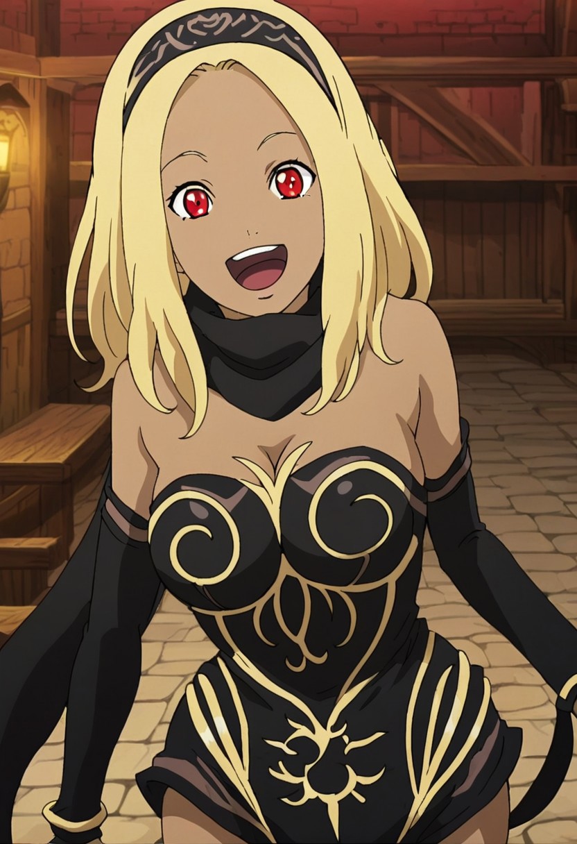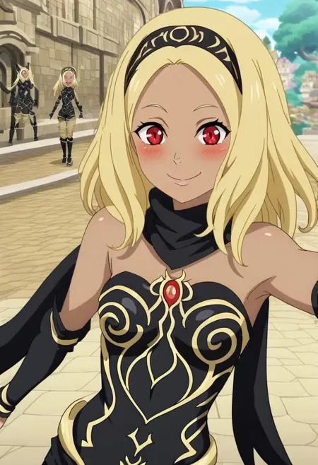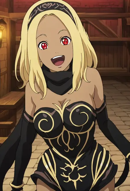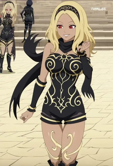 Base: Kat, dark skinned girl, long blonde hair, red eyes, black bodysuit,