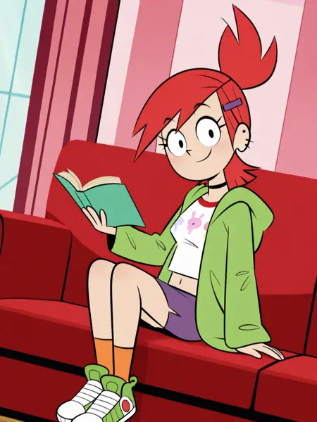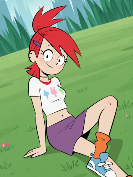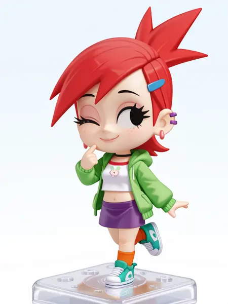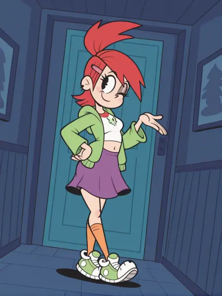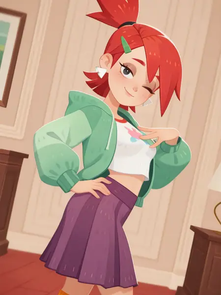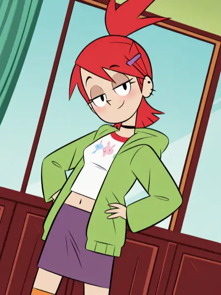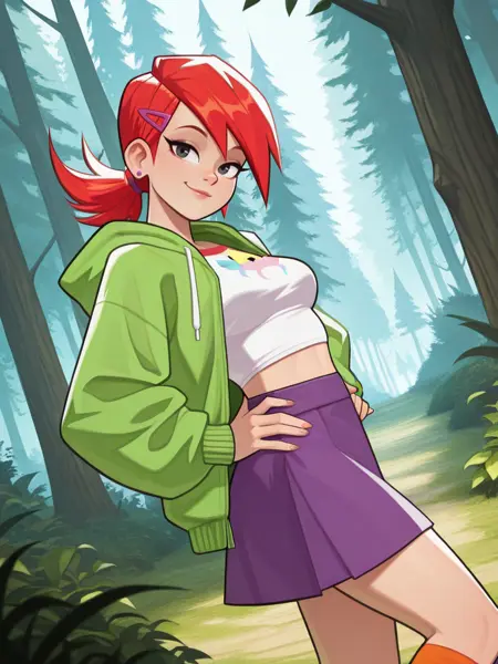 基础服装:"红发,微笑,黑眼睛,发夹,马尾,露脐,运动鞋,紫色裙子,橙色袜子,耳环,白色短上衣,珠宝,绿色连帽衫,帽子,敞开的连帽衫"