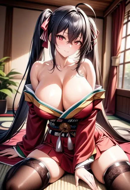 触发词:taihou_a,深红色眼睛,黑发,长发,头发遮住眼睛,极长发,呆毛,交叉刘海,双马尾,丝带,发带,巨乳,裸露肩膀,红色和服,日本服饰,腰带,过膝袜,露肩,大腿,黑色过膝袜,