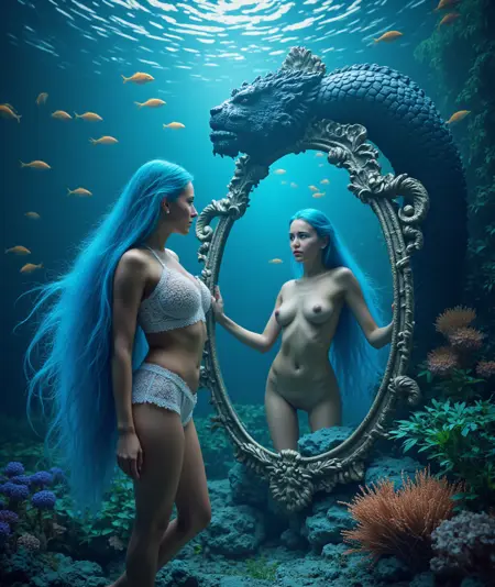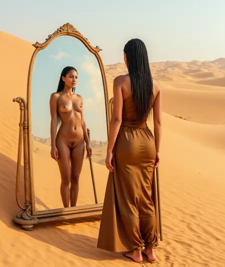 現実の服を着た状態で、鏡の中で裸。これは少し馬鹿げた結果をもたらすが、それなりに良い! 実際の反射を頻繁に無視している。効果を生成するには、見たい服を説明してください。