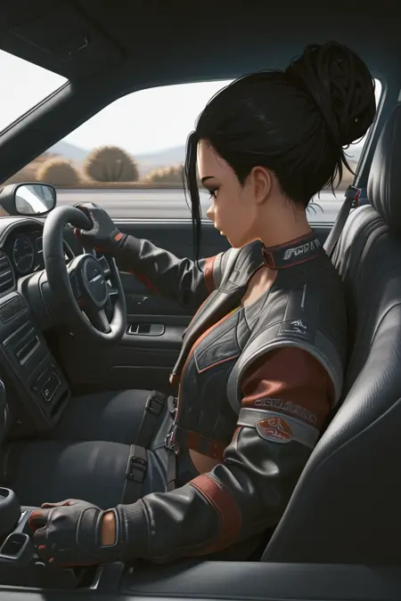 panam, 1girl, solo, black hair, looking at viewer, brown eyes, jacket, denim, default outfit