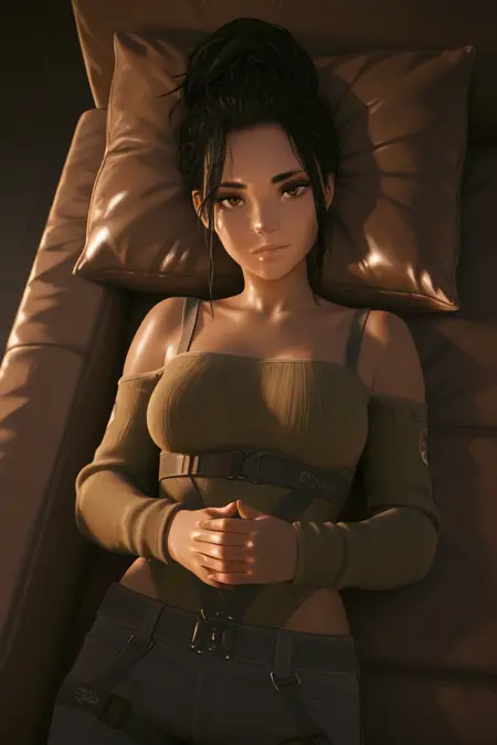 panam, 1girl, solo, black hair, looking at viewer, brown eyes, bare shoulders, denim, alternate outfit