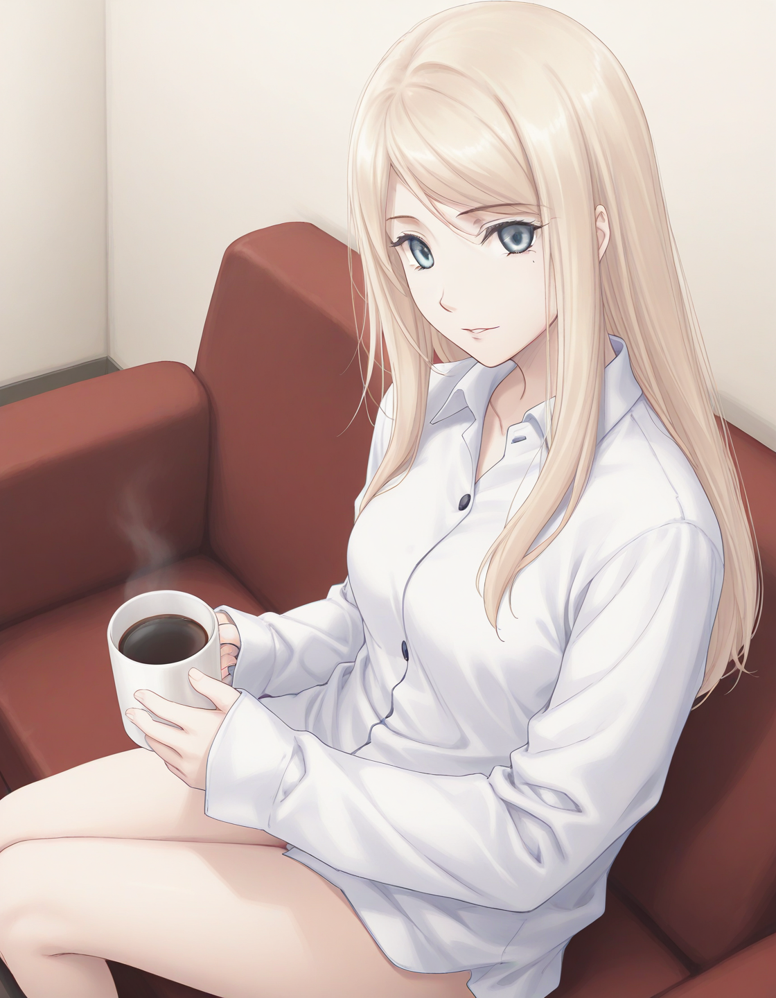 maris stella, blonde hair, long hair, blue eyes, mole under eye, beret, blue dress, ribbon, long skirt, white gloves