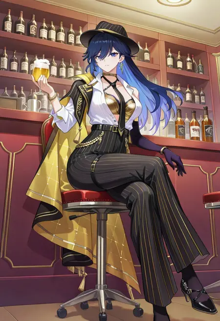 1girl, Lawine-Lone-Performance, ahoge, blue eyes, dark blue hair, blue hair, colored inner hair, long hair, black headwear, fedora, striped pants, striped headwear, black pants, high-waist pants, jewelry, sleeveless shirt, white shirt, open shirt, shirt tucked in, black undershirt, gold bra, bra over clothes, black necktie, necktie, gold choker, single earring, single-shoulder cape, black cape, two-tone cape, yellow cape, tassel-trimmed cape, single bare shoulder, black single elbow glove, black glove, gold bracelet, gold crossed belts, black belt, buttons, purple strap, black shoes, thigh strap,