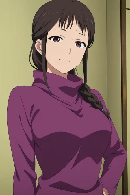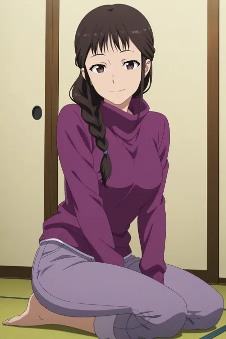 segawa misato, long hair, brown hair, sidelocks, braided ponytail, hair tie, half updo, hair ornament, brown eyes, stud earrings, long sleeves, purple sweater, high collar, purple pants, pants rolled up