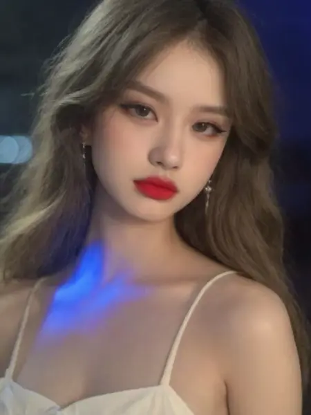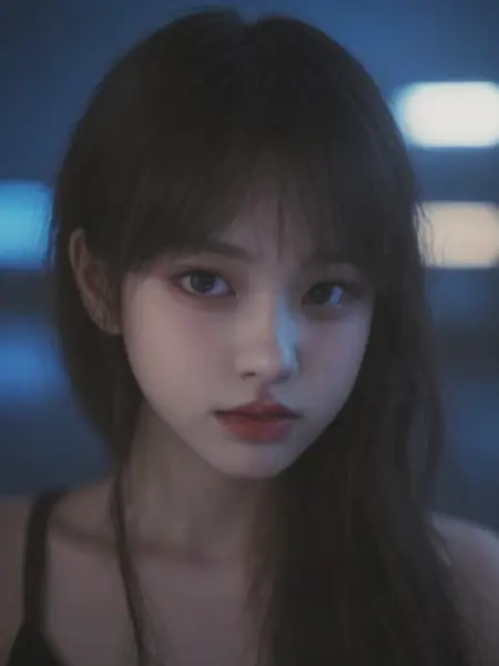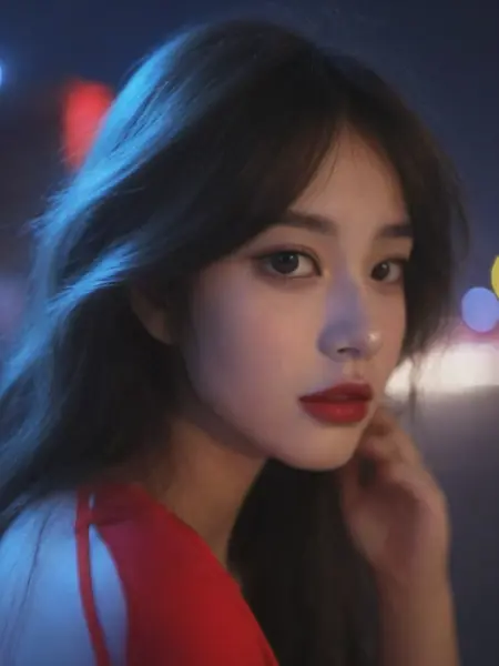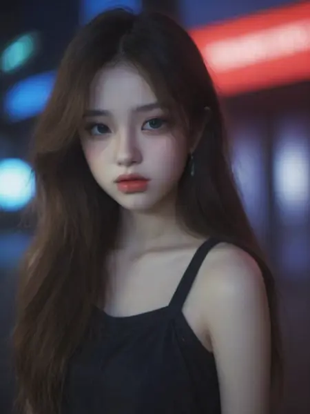 一位女孩,长发,半身像,城市,未来,科幻,黑色丝绸,短裤,夜景,午夜,蓝光,霓虹,夜晚,面部特写,精致五官,美女,美丽,迷人,时尚女孩,红唇,写实,妆容,lora:girls_s4:0.6