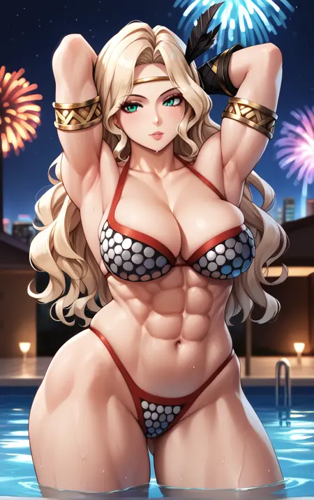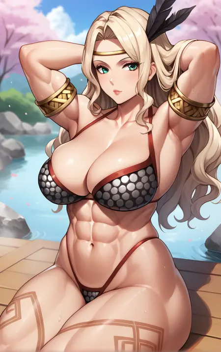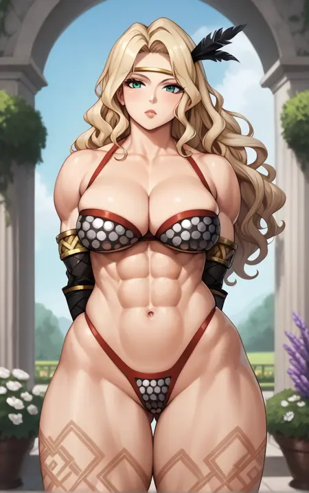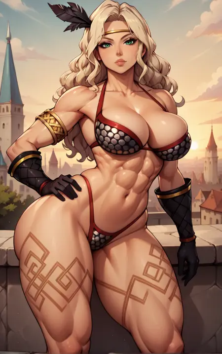 1girl, blonde hair, circlet, feather hair ornament, green eyes, leg tattoo, long hair, muscular female, tall female, wavy hair, large breasts, abs, tattoo, thick thighs, obliques, hair ornament, lips, thighs, dark-skinned female,