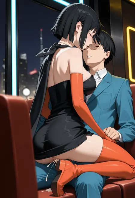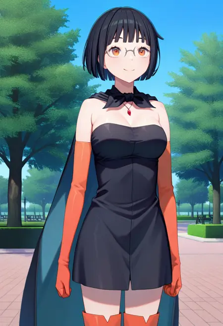 복장 - 검은 드레스, 어깨 끈 없는 드레스, 짧은 드레스, 목걸이, 펜던트, 검은 망토, 팔꿈치 장갑, 주황색 장갑, 허벅지 부츠, 주황색 신발