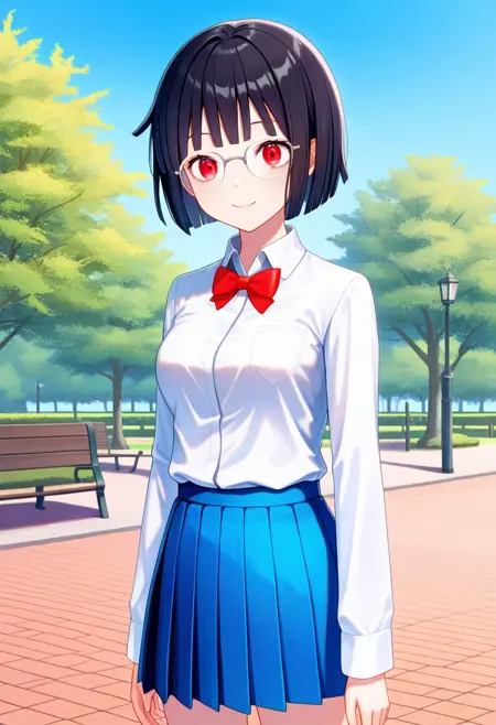 복장 - 흰 셔츠, 빨간 리본 넥타이, (짧은 소매 / 긴 소매), 파란 치마, 접은 치마 (참고 2 참조)