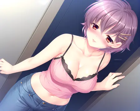 mahogfq, kinmedai pink, red eyes, short hair, hairclip, purple hair, large breasts,