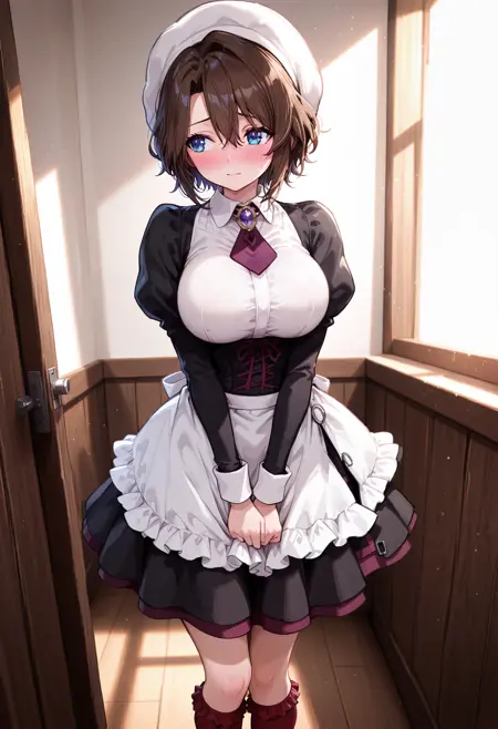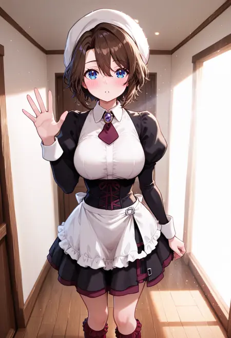 | 训练词汇 | shannon, short hair, hair between eyes, brown hair, medium breasts, blue eyes,已复制! apron,beret, black shirt, black skirtfrilled apron, frilled socks, frills, hat, juliet sleeves, kneehighs, maid, necktie, puffy sleeves, purple brooch, red necktie, red socks, shirt,已复制! |