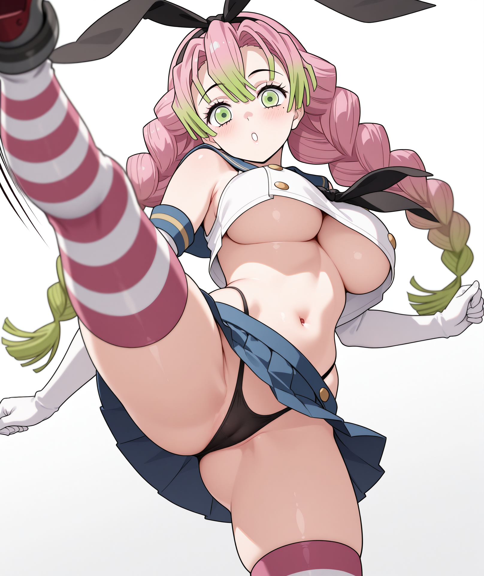 skirt, thighhighs, underwear, panties, pleated skirt, striped, miniskirt, blue skirt, black panties, highleg, striped thighhighs, highleg panties, microskirt,